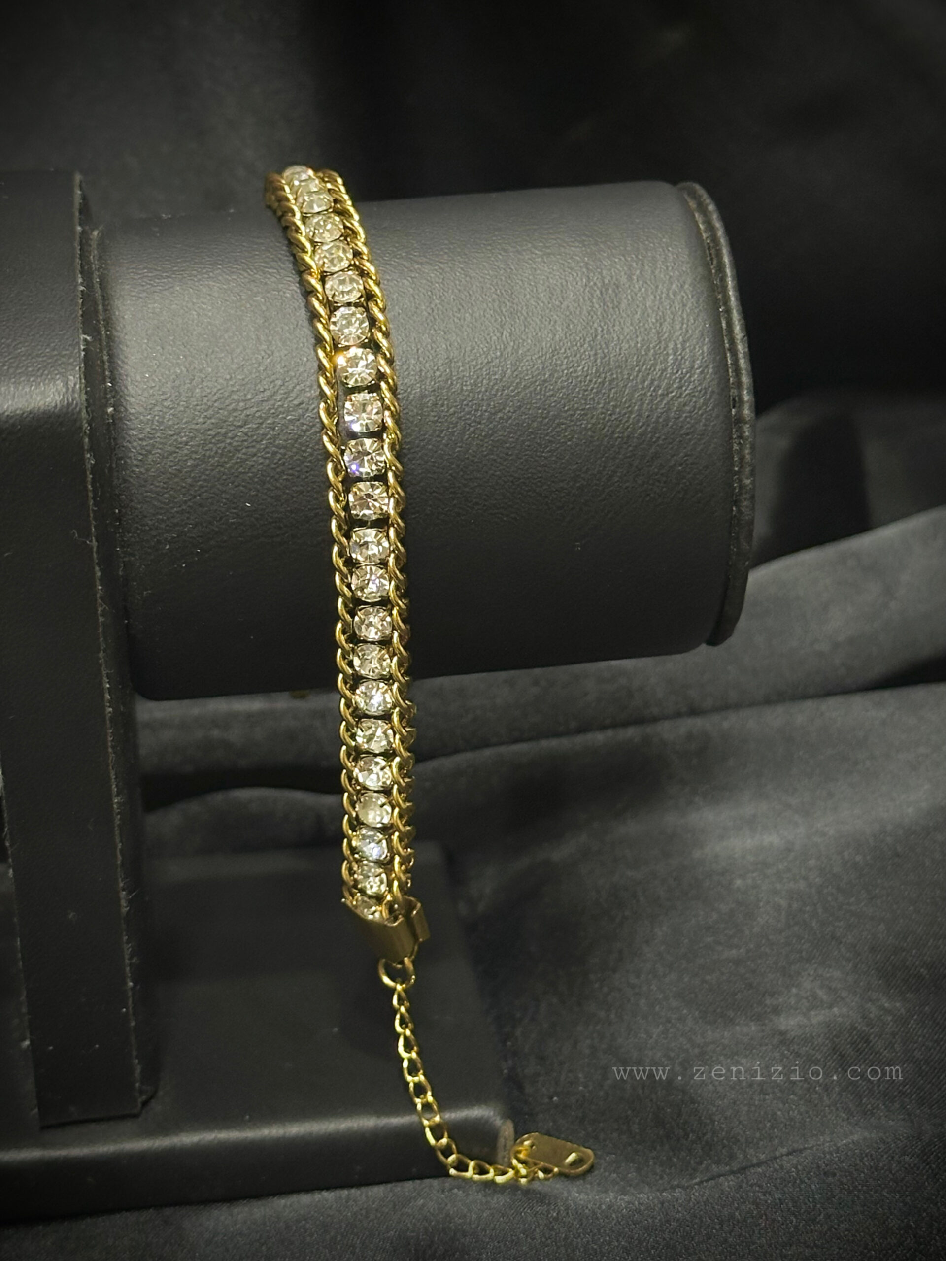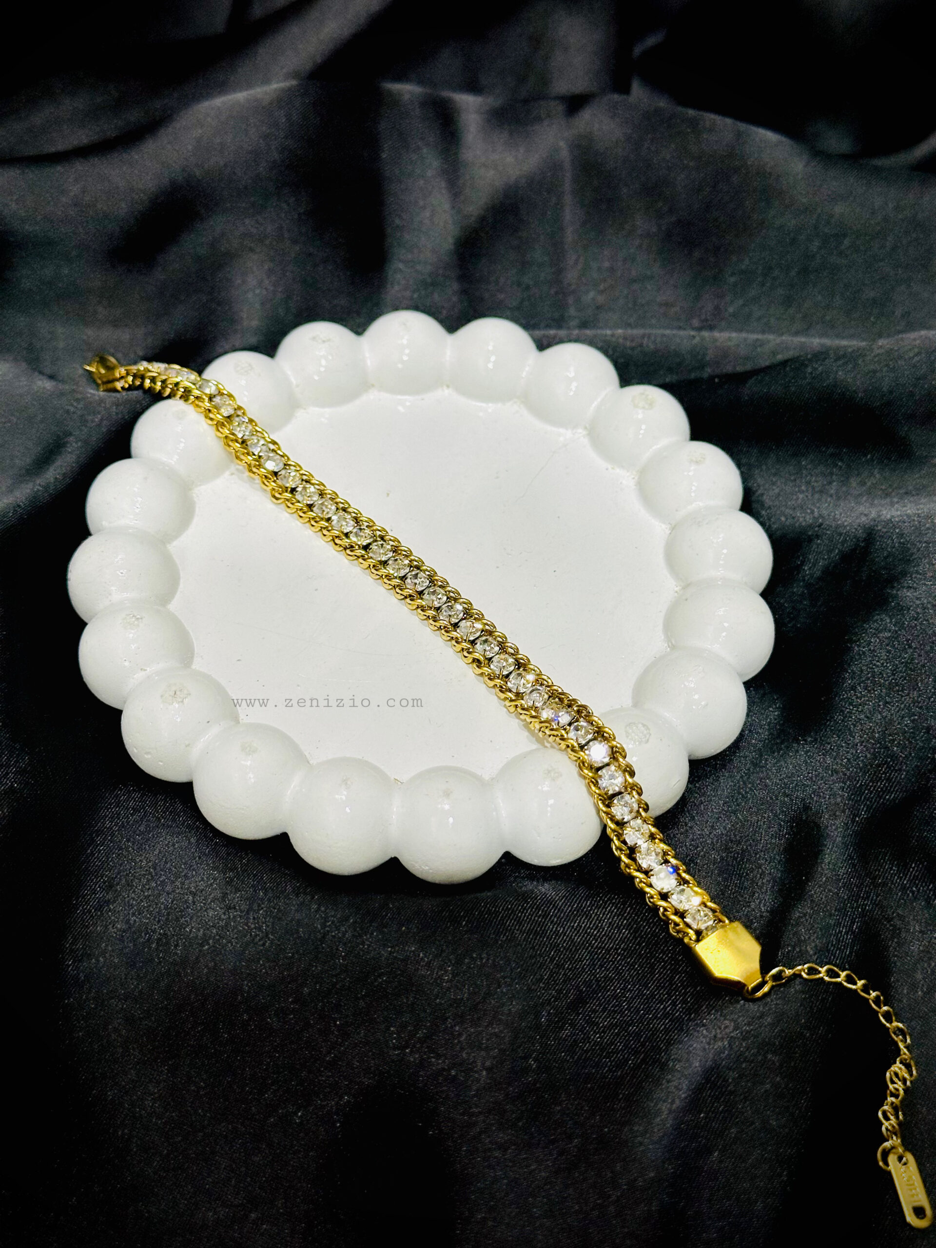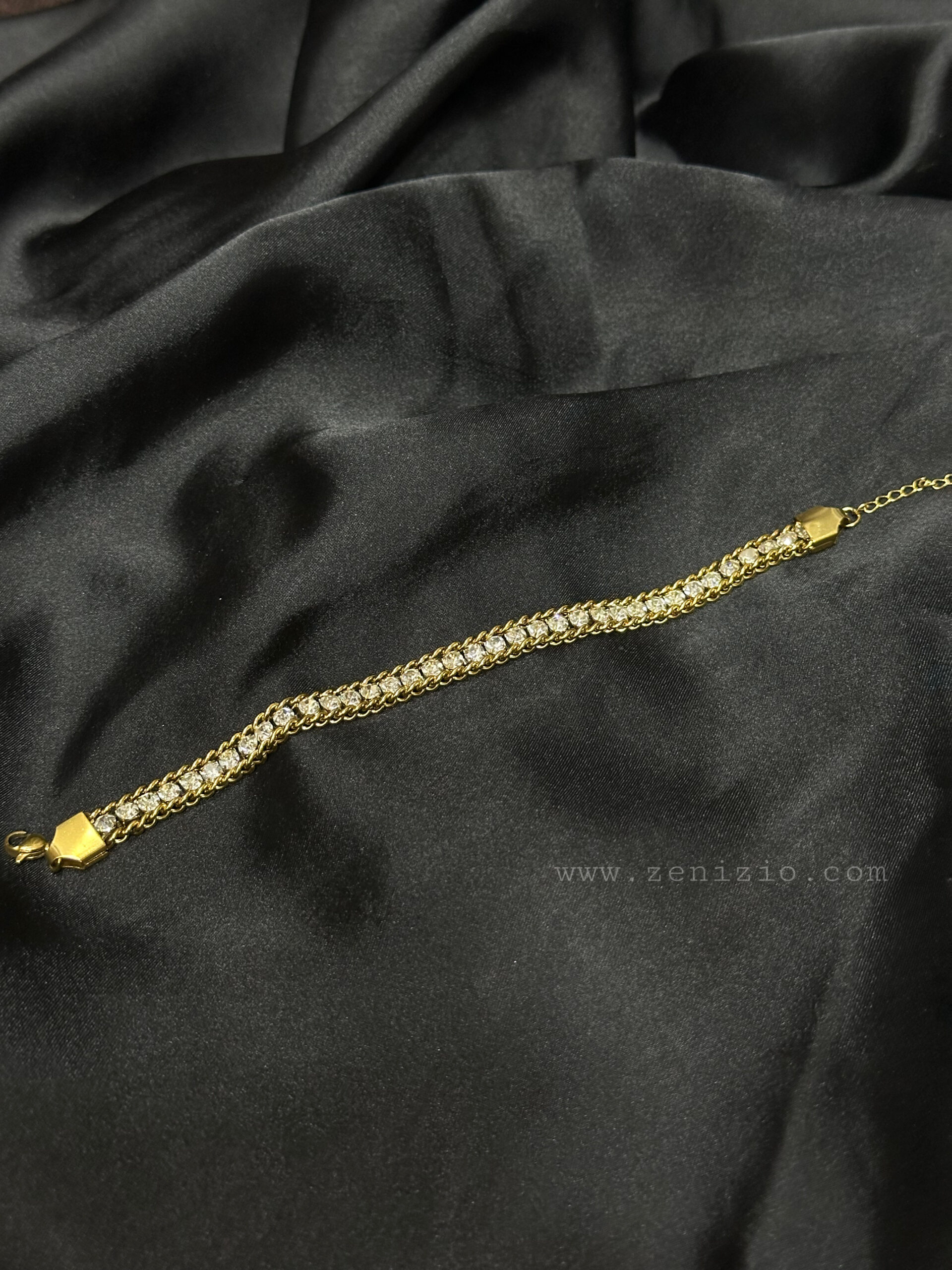 • Stones: Continuous line of sparkling clear stones (likely simulated diamonds).